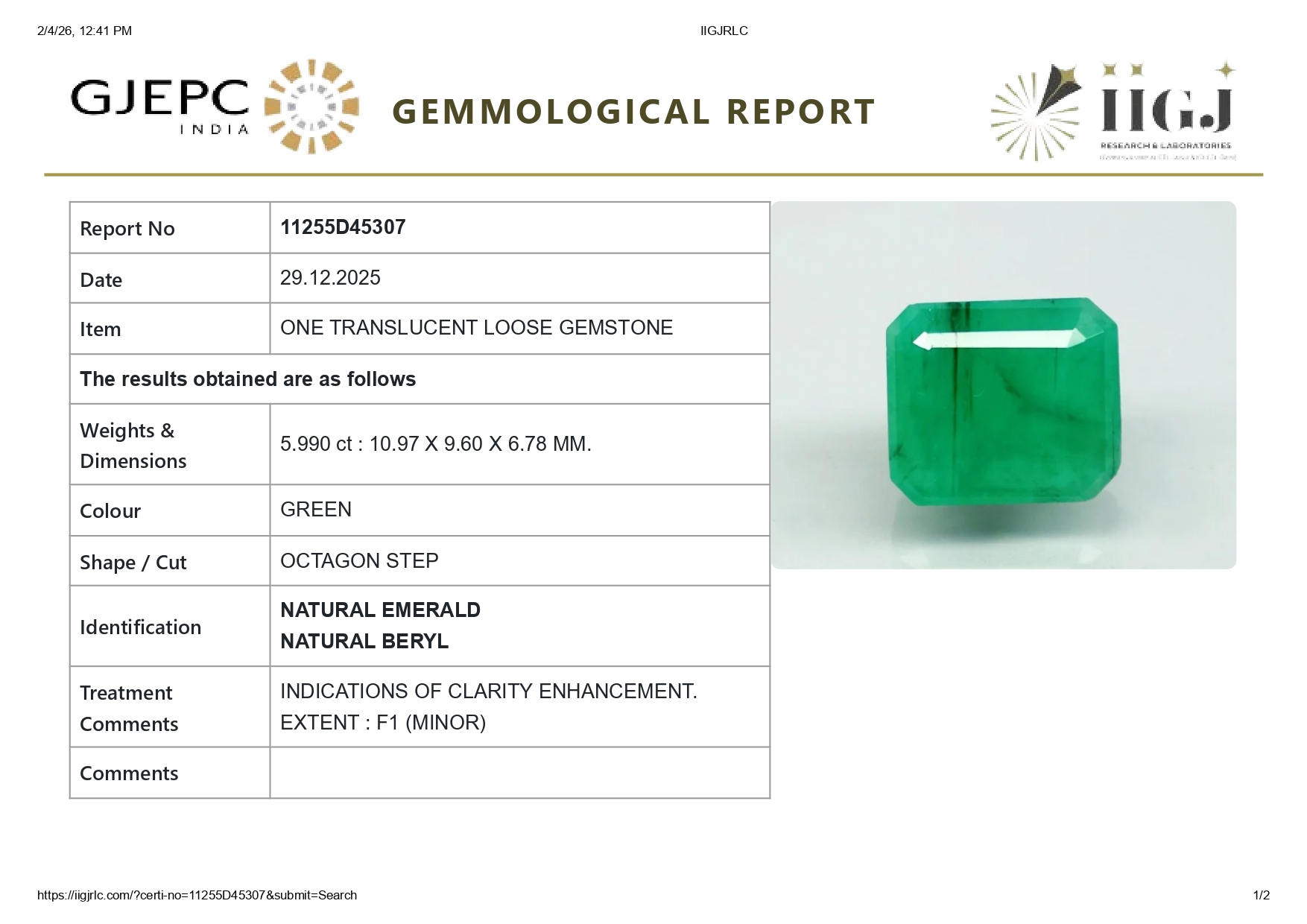 Buy one beautiful translucent 5.99 Carat/ 6.58 Ratti original Emerald online. It has a Octagon shape and a clarity grade of eye clean (evaluated at eye level), medium Green color intensity, and an excellent polish. The origin of this emerald is Zambia. This emerald stone is unheated & untreated and certified from IIGJ Govt. lab.