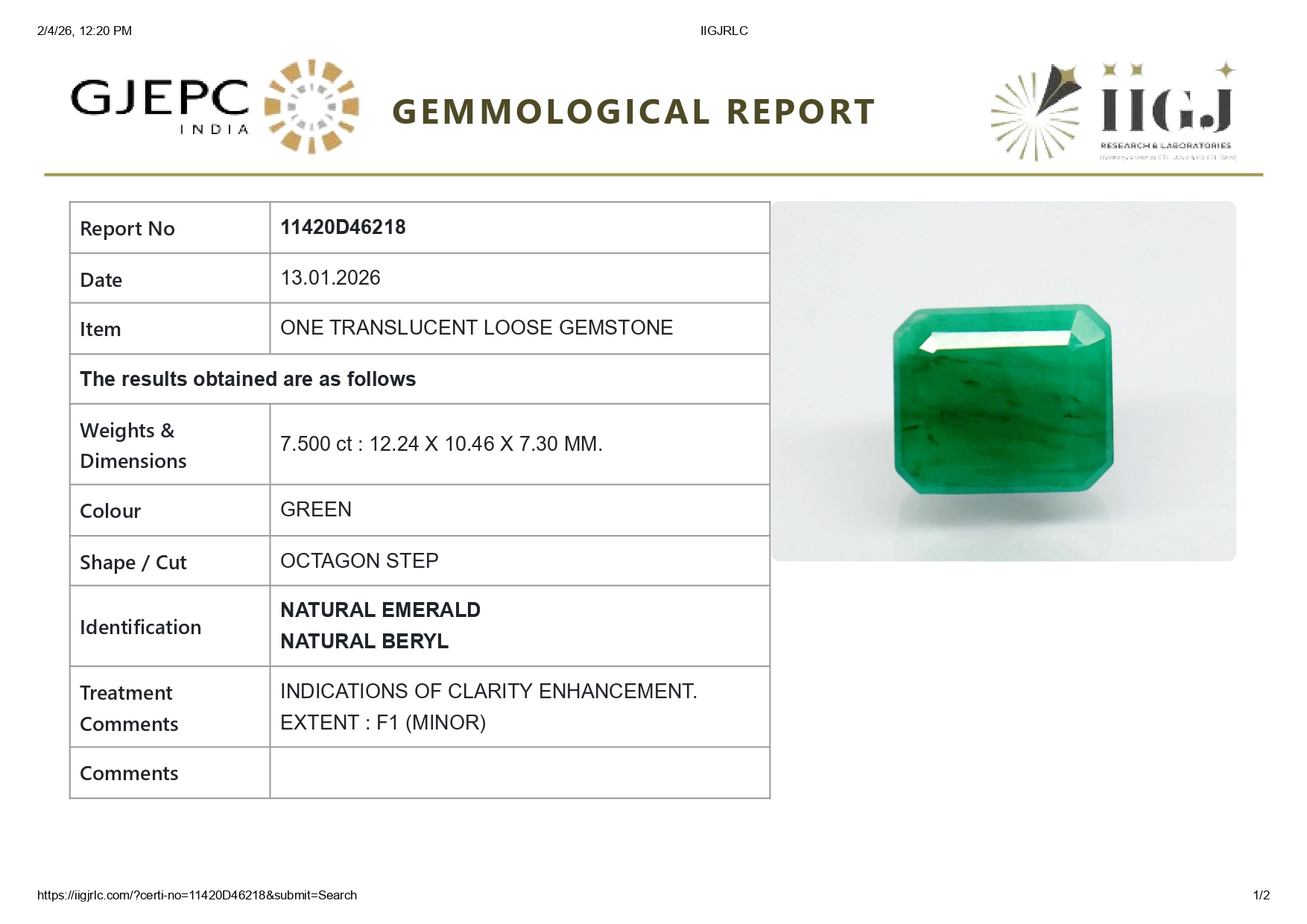 Buy one beautiful translucent 7.50 Carat/ 8.24 Ratti original Emerald online. It has a Oval shape and a clarity grade of eye clean (evaluated at eye level), medium Green color intensity, and an excellent polish. The origin of this emerald is Zambia. This emerald stone is unheated & untreated and certified from IIGJ Govt. lab.