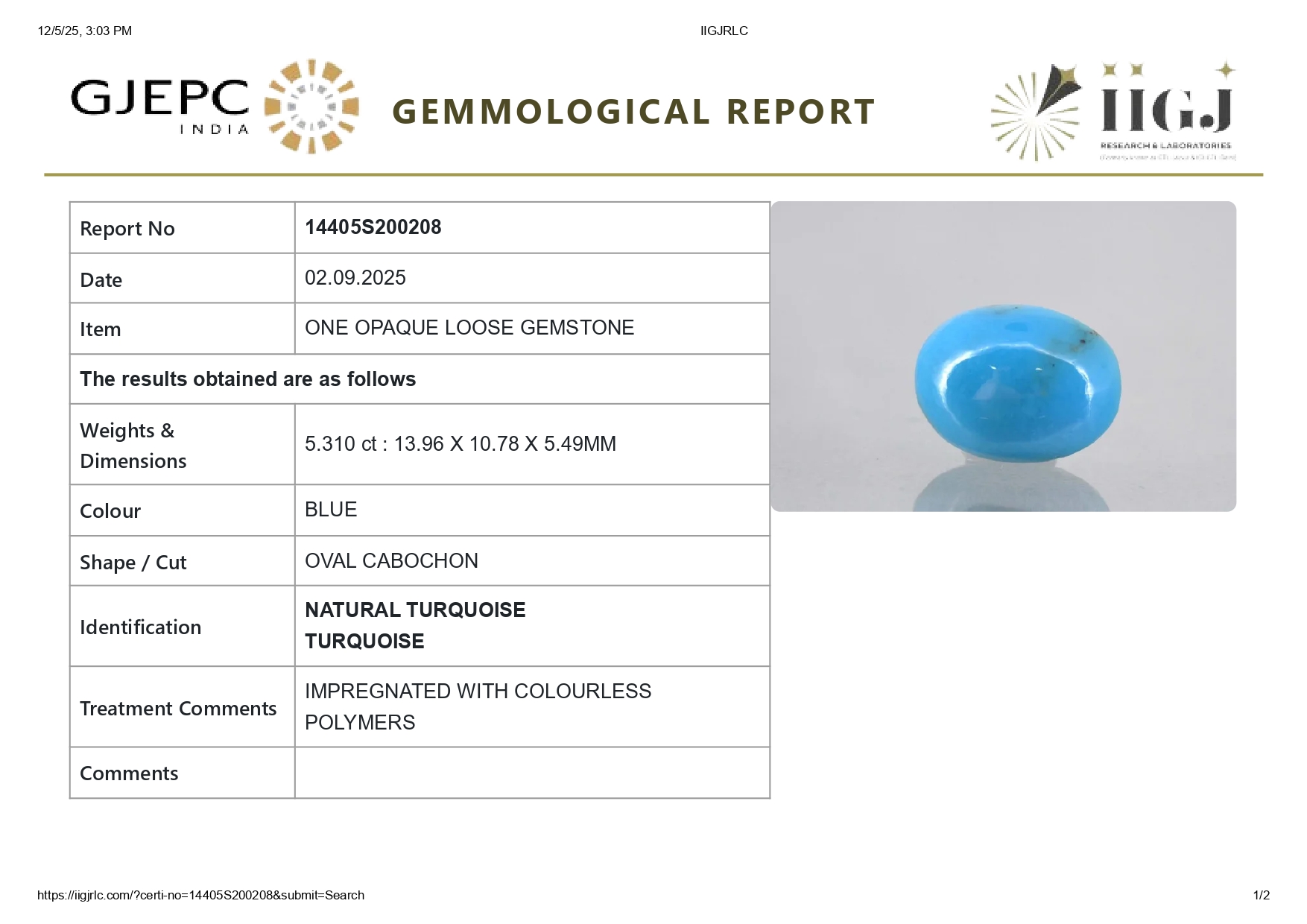 NATURAL TURQUOISE (FIROZA) 5.31 CARATS
