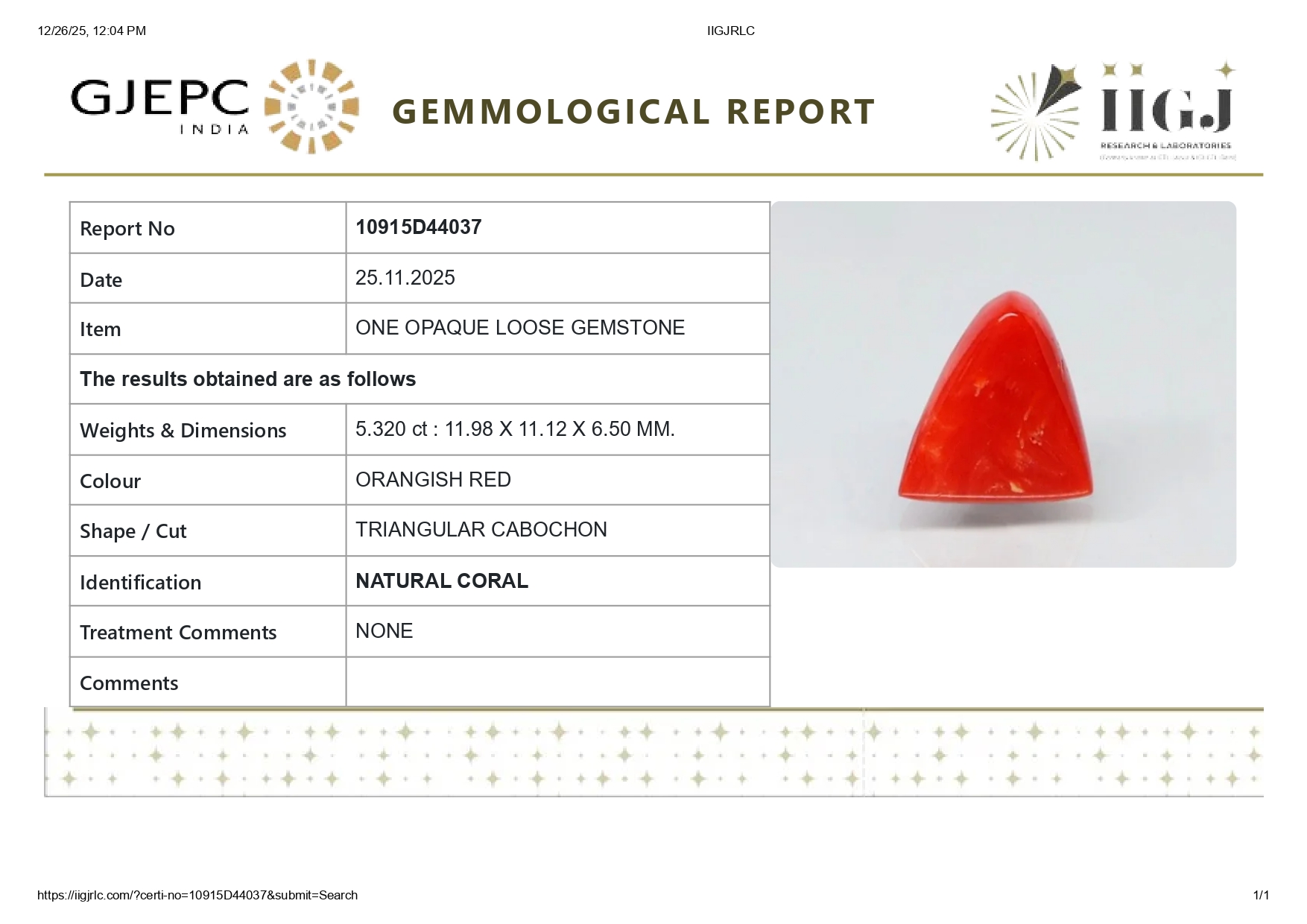 Buy 5.32 carats (5.85 Ratti) 100% natural Italian red coral (Moonga) stone online, directly imported from Italy (also called available"Italian Red Coral"). Moonga Stone is a source of enormous power & strength. Check out the exclusive inventory online all shapes (Triangular, Capsule & Oval) with a reputed IIGJ Certificate